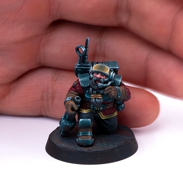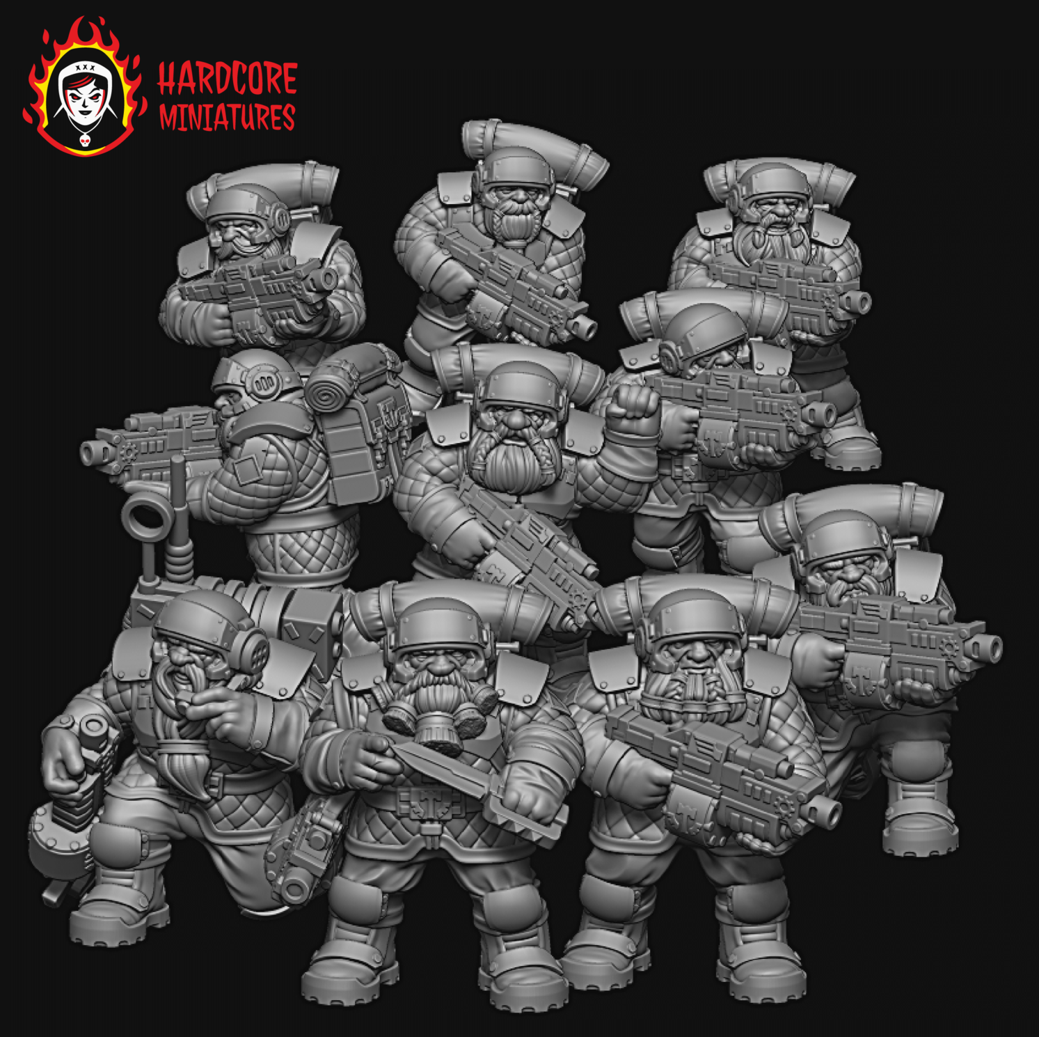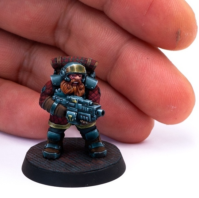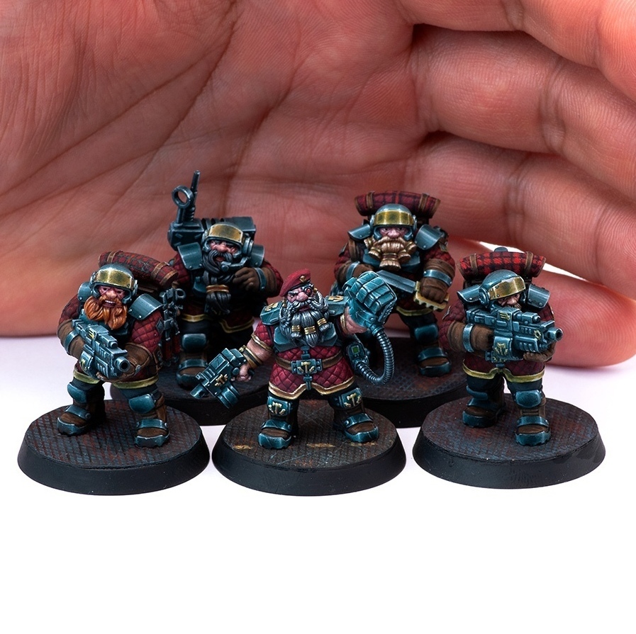 The other main line of miniatures that we develop is space dwarves. These minis were designed to proxy the human army in the grimdark wargame. You can see a lot of core troopers, mortars, and special weapons available at the moment. We have a command group in plans so the army is cohesive and can be set up for a battle.